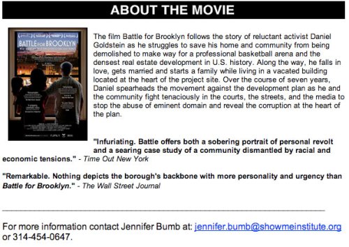 The Show-Me Institute and nextSTL present a free advance screening of the Battle for Brooklyn, a documentary about the abuse of eminent domain to make way for luxury housing and a stadium.