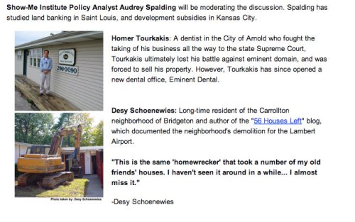 Afterwards, we will host a panel discussion about the threat of eminent domain in the Saint Louis area. Panelists include: